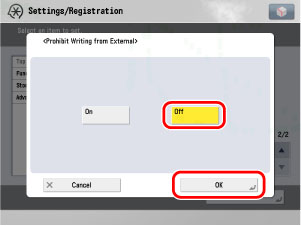 (Settings/Registration) → [Function Settings] → [Store/Access Files] → [Advanced Box Settings] → [Prohibit Writing from External].