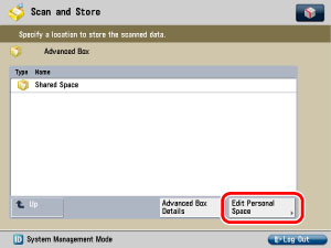 Press [Scan and Store] or [Access Stored Files] on the Main Menu screen → press [Advanced Box].