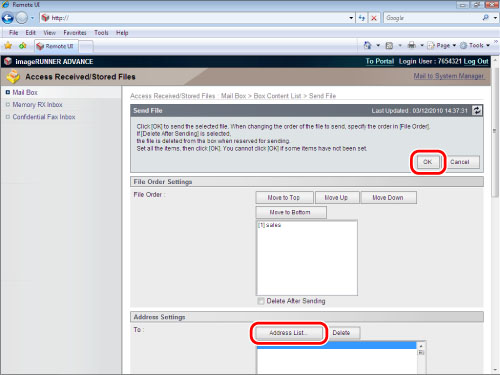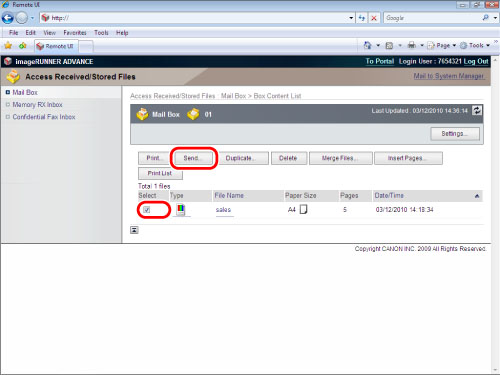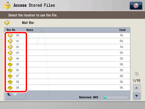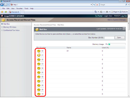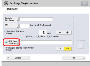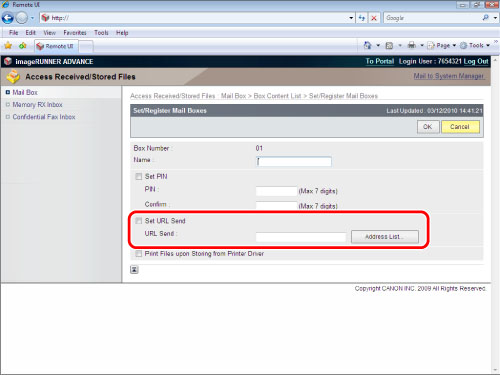 Access the Remote UI → click [Access Received/Stored Files] → [Mail Box] → click the number of the Mail Box for which to set URL Send.
