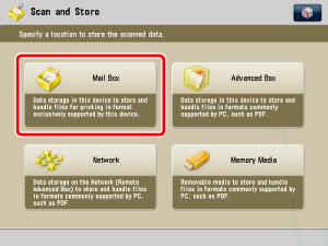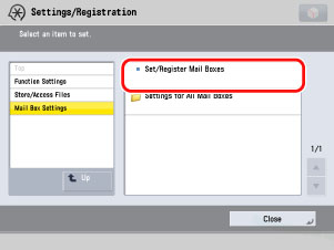 (Settings/Registration) → [Function Settings] → [Store/Access Files] → [Mail Box Settings] → [Set/Register Mail Boxes]. |