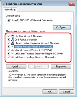 For Windows Vista, click [Control Panel] → [Network and Internet] → [Network and Sharing Center] → [View Status] for Local Area Connection → [Properties]. In the [Local Area Connection] dialog box, select [Client for Microsoft Networks], [File and Printer Sharing for Microsoft Networks], [Internet Protocol Version 6 (TCP/IPv6)], and [Internet Protocol Version 4 (TCP/IPv4)].