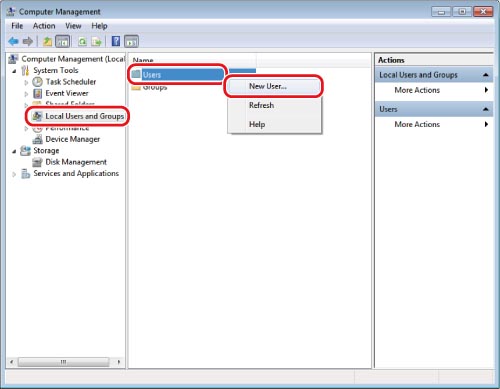 For Windows XP, right-click [My Computer] → click [Manage] → [Computer Management (Local)] → [Local Users and Groups] → right-click [User] → select [New User]. For Windows Vista/Windows 7, click