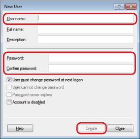 On the [New User] dialog box, enter [User Name], [Password], [Confirm password] → click [Create].
