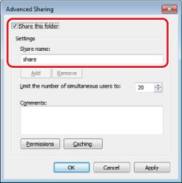 For Windows XP, right-click the shared folder → select [Properties] → click the [Sharing] tab → click [Share this folder] → enter [Share name]. For Windows Vista/Windows 7, right-click the shared folder → select [Properties] → [Sharing] → [Advanced Sharing] → [Share this folder] → enter [Share name].