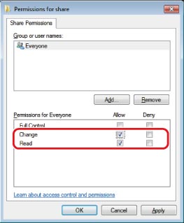 Click [Permissions] → check that the user name or group name to allow access to the shared folder is selected → check that [Allow] for [Change] and [Read] are selected.
