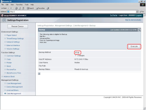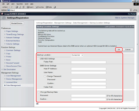 You can store data such as Mail Box data in a specified back up storage. You can back up the following data:
