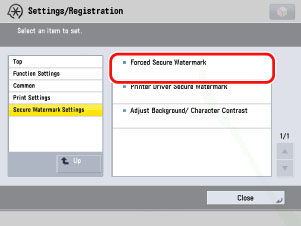 (Settings/Registration) → [Function Settings] → [Common] → [Print Settings] → [Secure Watermark Settings] → [Forced Secure Watermark].