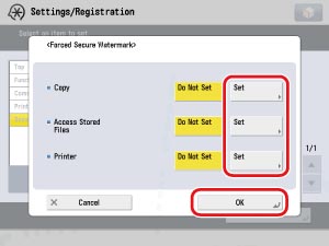 Press [Set] for the functions with which you want to use Forced Secure Watermark → specify the watermark type, background, text color, and other settings → press [OK] → [OK].
