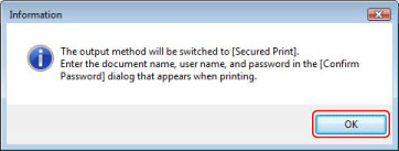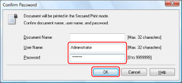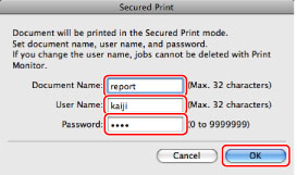 Enter the document name, user name, and password in the [Secured Print] dialog box → click [OK].