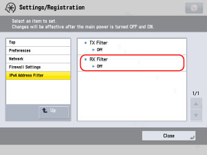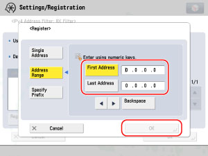 (Settings/Registration) → [Preferences] → [Network] → [Firewall Settings] → [MAC Address Filter].