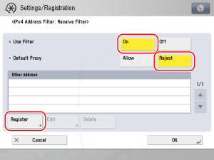 Press [On] for <Use Filter> → press [Reject] for <Default Policy> → press [Register].