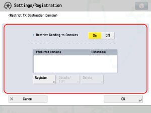 (Settings/Registration) → [Function Settings] → [Send] → [E-Mail/I-Fax Settings] → [Restrict TX Destination Domain].