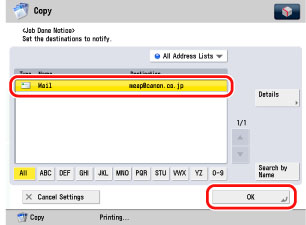 Select the destination where the job done notice is to be sent → press [OK].