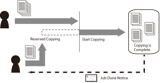 When the machine is processing a job, you cannot start a new job until the current job is complete. For instance, if a large copy job is processing, you must wait until the copy job is completely finished. In this case, you can use the Reserved Copying mode to scan originals while a copy job is processing, and start copying right after the current job is complete. Specifying to receive a notice when your copy job is complete also helps you to effectively process the copy job.
