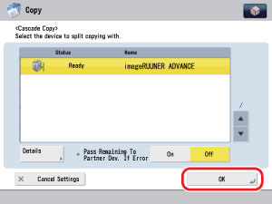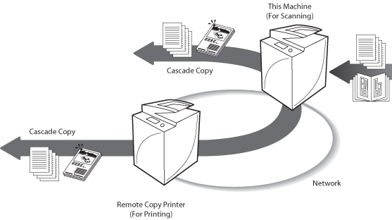 If an error occurs in either this machine or the cascade copy printer, the remaining copy jobs are assigned to the machine which is operating normally.