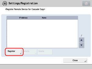 (Settings/Registration) → [Function Settings] → [Copy] → [Register Remote Device for Cascade Copy].