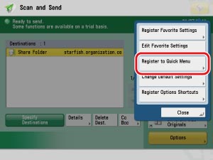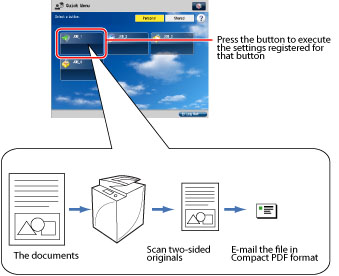 The Quick Menu is a function that increases the efficiency of operations that use functions of the machine for an office. You can create and register a series of frequently used functions such as Copy, Scan and Send, and Scan and Store in one button.
