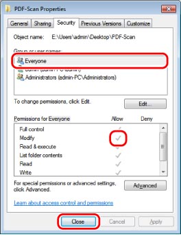 For Windows XP, select [Everyone] → select [Allow] for [Modify] → click [OK]. For Windows Vista/7, select [Everyone] → select [Allow] for [Modify] → click [OK] → [Close].