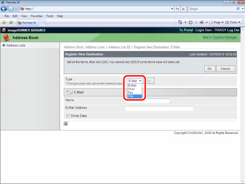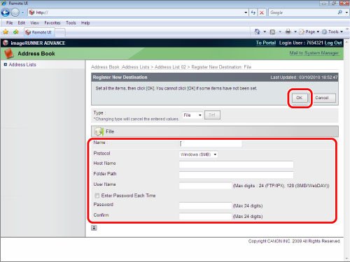 If <Check the login destination, user name, and password> is displayed, you cannot set the login/destination from the machine.