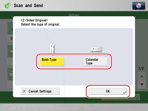 Press [2-Sided Original] → specify the type of two-sided original → press [OK].