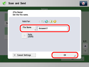 When PDF (OCR) or XPS (OCR) is set as the file format, set [Auto (OCR)] to 'On' to automatically extract the first text block in the document for use as its filename.