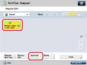 Select the flow to duplicate ([Reduce paper size and send]) → press [Duplicate].
