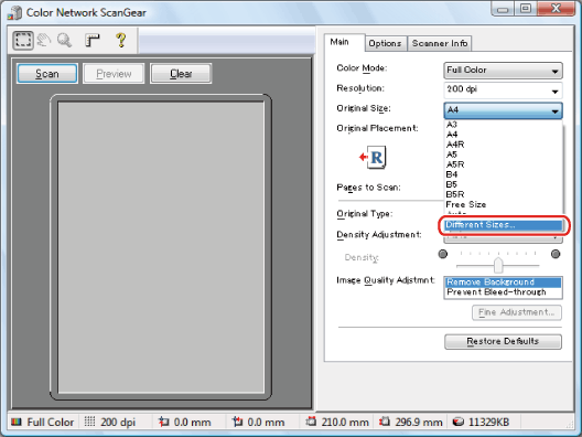 If you are scanning a custom size paper original, select [Custom] for [Original Size] in the [Main] sheet. Also, in such cases the width of all pages must be the same.