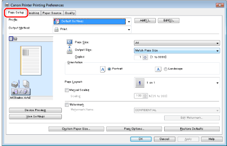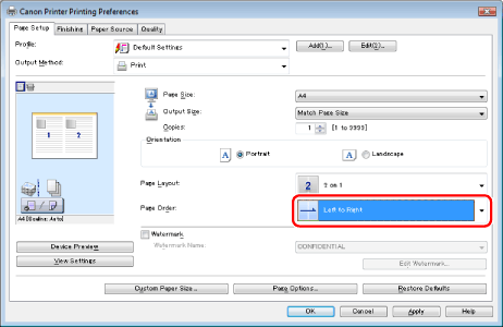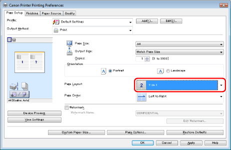If you cannot select the options for [Page Layout], display the [Device Settings] sheet, and then select [Auto] or [Enabled] from [Spooling at Host]. For instructions on how to display the [Device Settings] sheet, see "Setting the Printer Options."