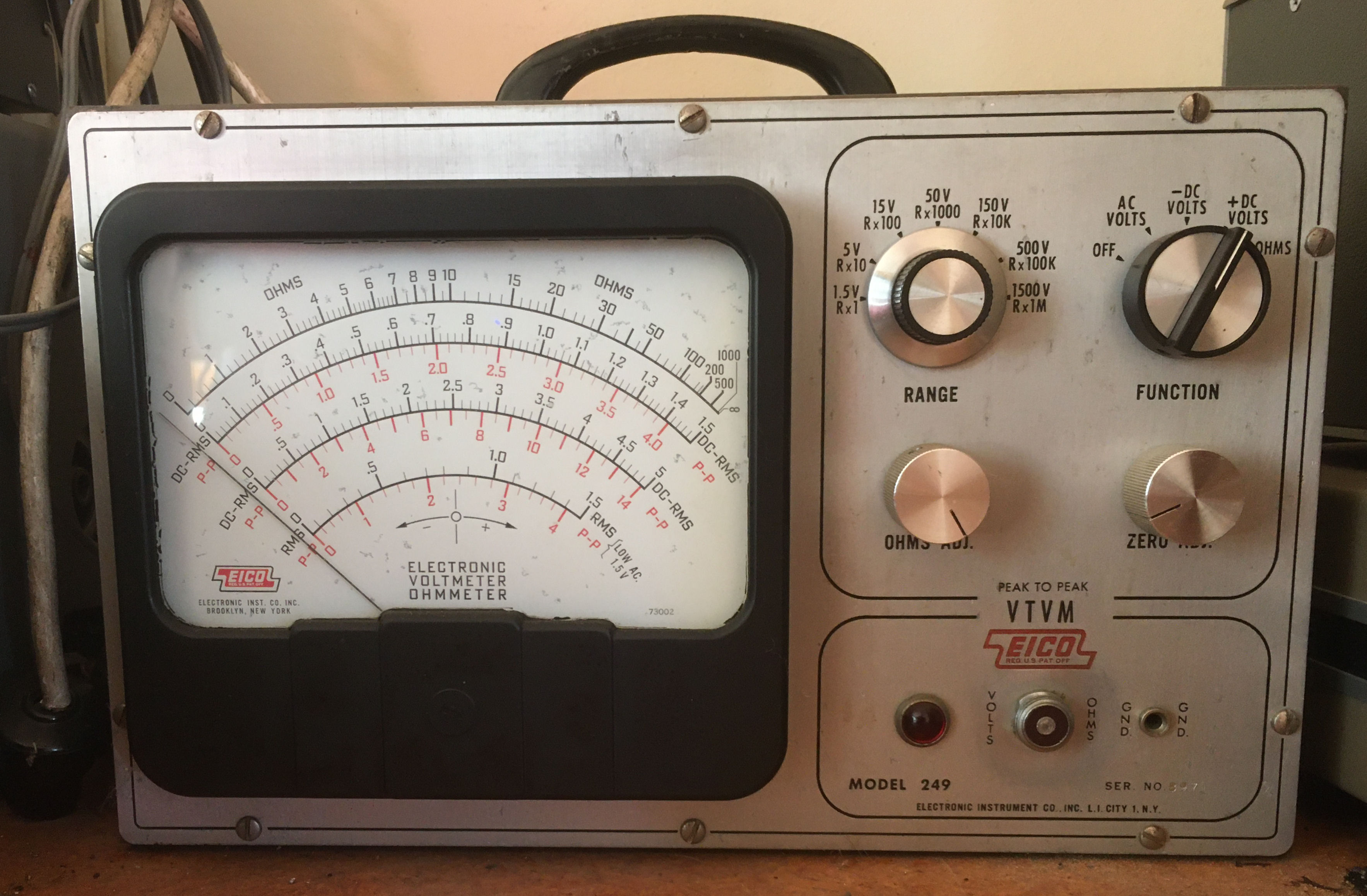 | 249 | Eico | Eico Model 249 Vacuum-Tube Volt Meter, Measuring ranges: AC: 4V - 4200V DC: 1.5V - 1500V Resistance: 0 Ohm to 1000 MOhm. |