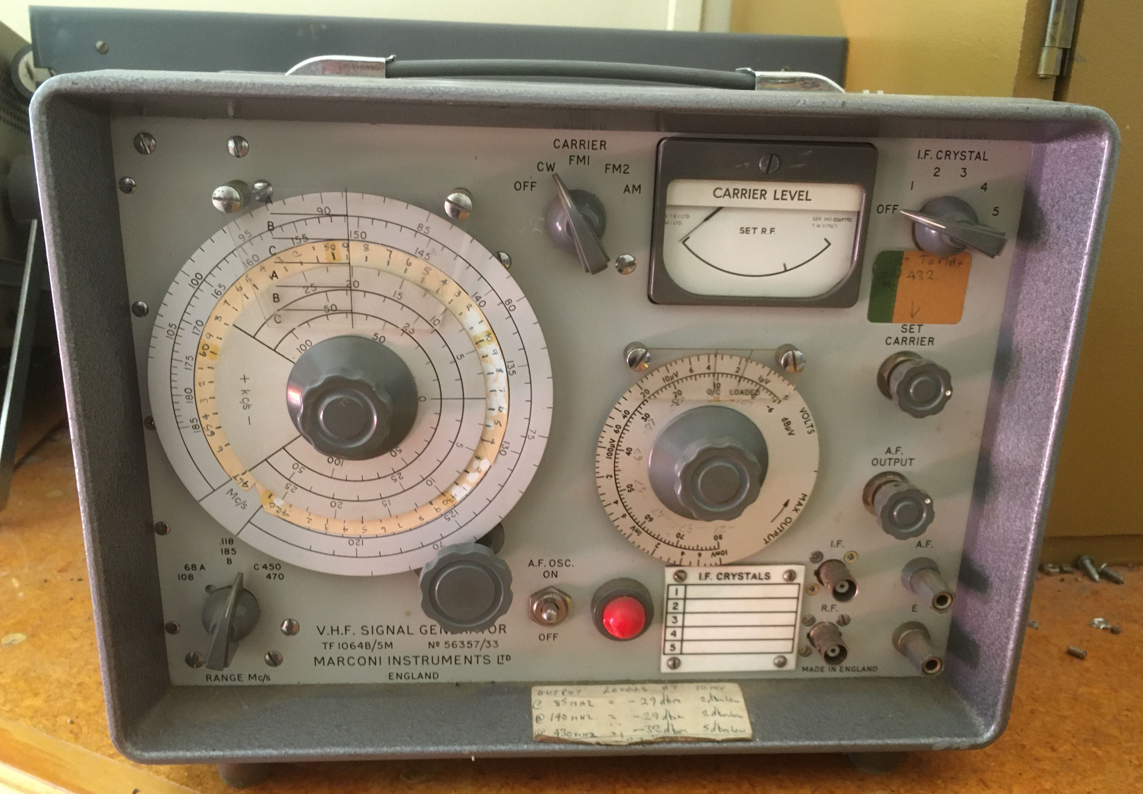 | TF1064B/5M | Marconi | Marconi TF1064B/SM VHF Signal Generator | https://www.casa.co.nz/Equipment/ZL2ANS/Gallery/images/TF1064B-Marconi_7080.JPG | |||||||||