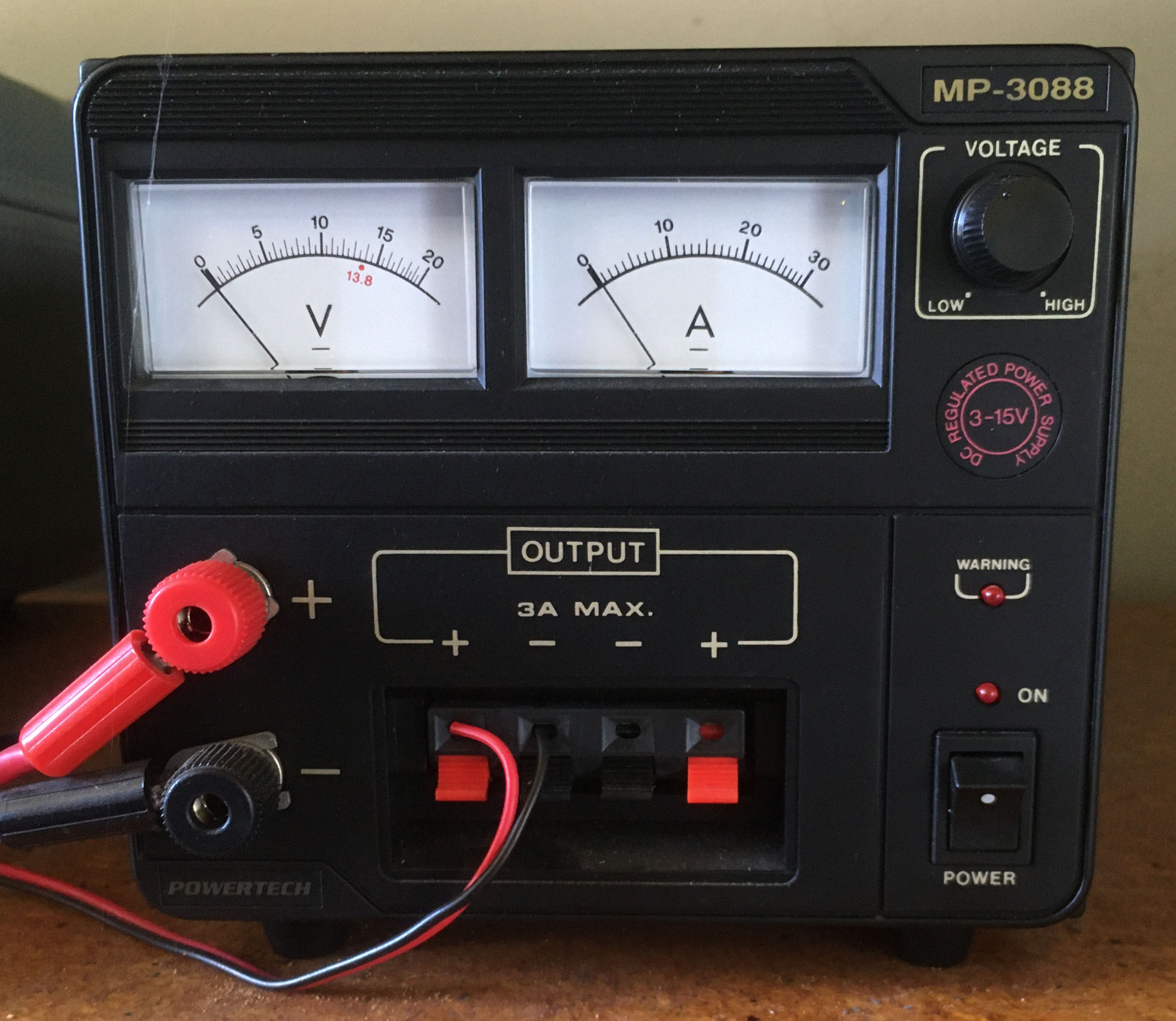 | MP-3088 | PowerTech | Low Voltage desk-top power supply, 13.8V 30A DC with dual analogue meters and low-current auxillary output. | NA | Like new - yet to be tested to full current. Featured in Silicon-Chip c: 2009: https://www.siliconchip.com.au/Issue/2009/March - MP-3088 Was Au$359 Now Au$249 |